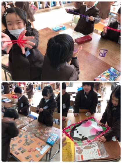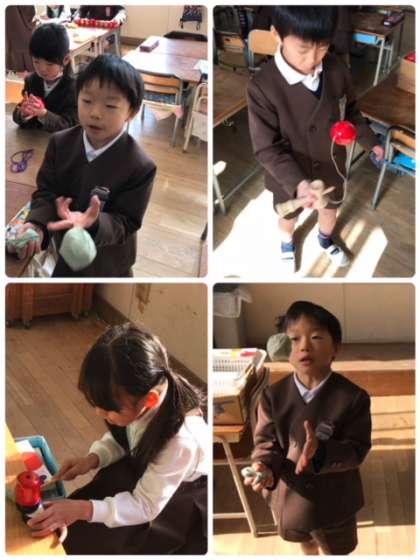 土曜授業で、各学年それぞれが通常授業をしています。そんな中、1年生は昔遊びをしていました。上手になるには、何度も何度も繰り返しチャレンジすることです。その中で、どうすればうまくいくかを考えて知ることが、大切なのです。遊びから学ぶのです。