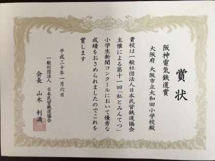 朝礼でも紹介しましたが、今年の夏に多くの皆さんが小学生新聞コンクールに募集した結果、大和田小学校が、阪神電気鉄道賞という賞をいただきました。これは、2年連続での受賞です。