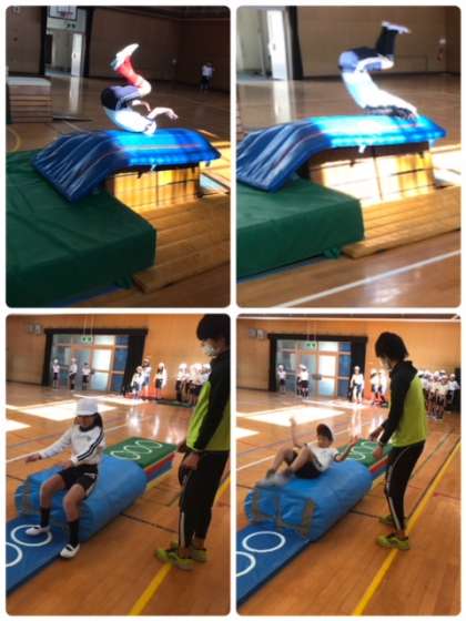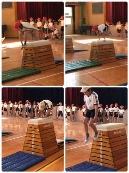 抱えこみ跳びと台上前転の練習をしていました。個人の課題に応じて、高さや向きをかえて、工夫して練習しています。