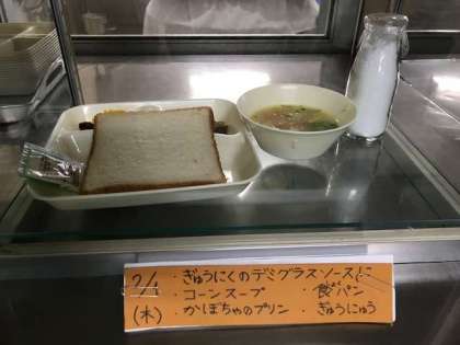 牛肉のデミグラスソース煮、コーンスープ、かぼちゃのプリン、食パン、牛乳
