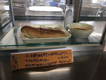 ミートボールと野菜のケチャップ煮、ツナと野菜のソテー、カリフラワーのレモン風味サラダ、レーズンパン、牛乳