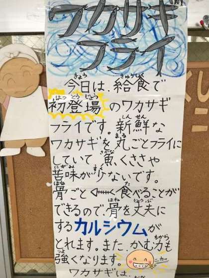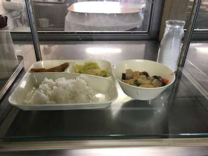 ワカサギフライ、一口ガンモとジャガイモの煮物、あっさりキャベツ、ご飯、牛乳