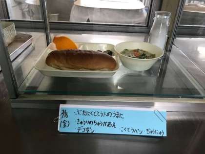 豚肉と豆腐のうま煮、キュウリの中華和え、デコポン、黒糖パン、牛乳