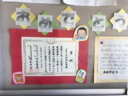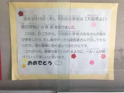 昨日19日の児童朝会でも紹介した、大和田小学校が受賞した、良い歯の表彰状を、保健室の長橋先生が、みんなに見えるように上手に掲示してくださいました。