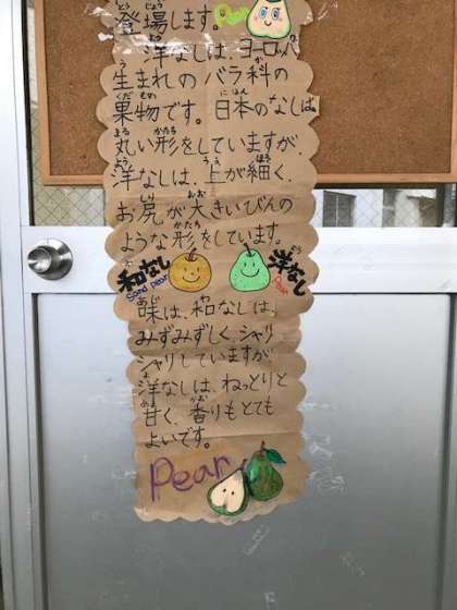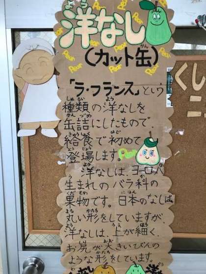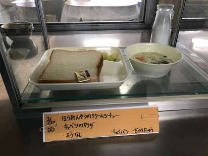 ほうれん草のクリームシチュー、キャベツのサラダ、洋ナシ、食パン、牛乳