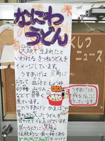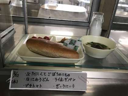 なにわうどん、豚肉とゴボウの煮物、プチトマト、ライ麦パン、牛乳