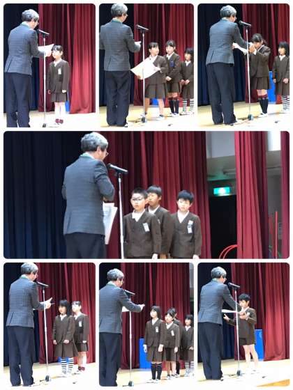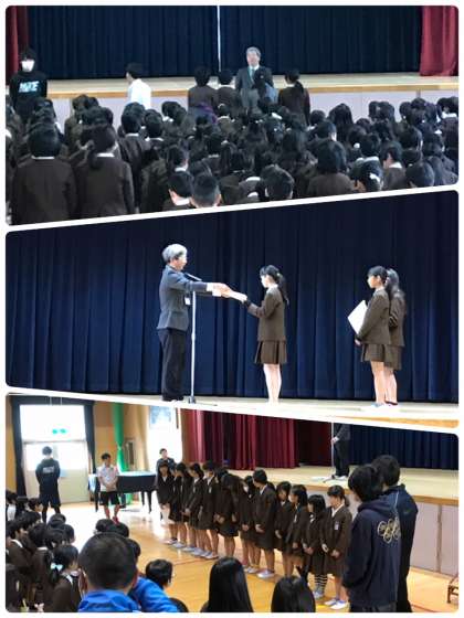 今日は講堂で全校朝会がありました。校長先生から、最後の学習参観では、学年のまとめとしてどの学年もよく頑張っていましたとお褒めの言葉をいただきました。