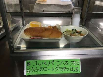 豆腐のミートグラタン、スープ煮、はっさく、コッペパン、牛乳