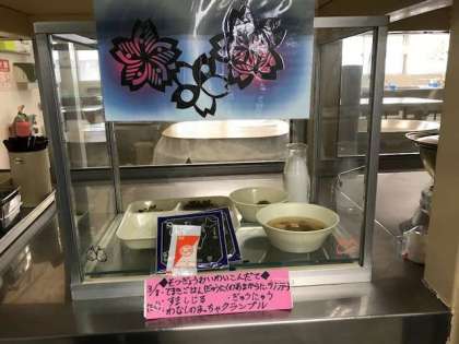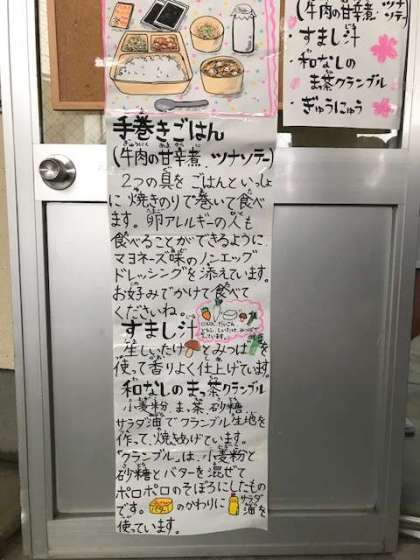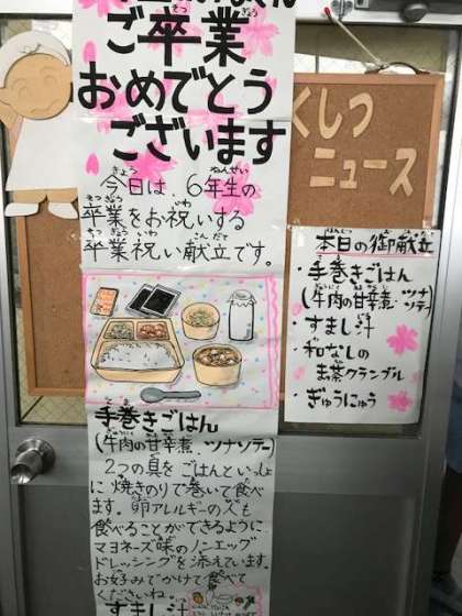 2種類の手巻きご飯を自分で作っていただきます。自分好みに味付けして、楽しく、美味しくいただき、思い出の給食の時間になっていることと思います。