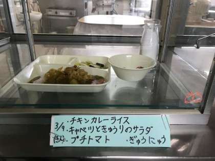チキンカレーライス、キャベツときゆうりのサラダ、プチトマト、牛乳