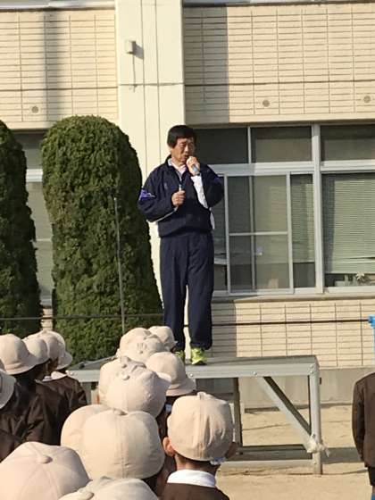 本日の朝は今年度最後の児童が揃う全校朝会になりました。