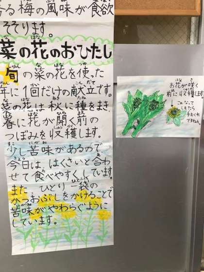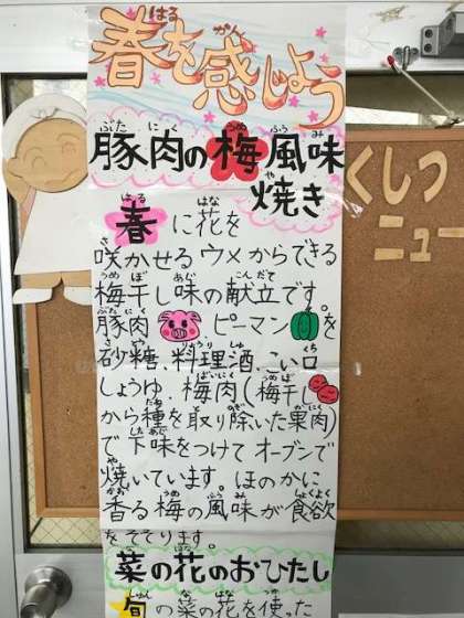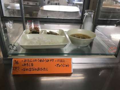 豚肉のうめ風味焼き、味噌汁、菜の花のおひたし、ご飯、牛乳