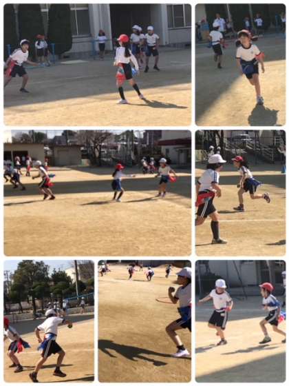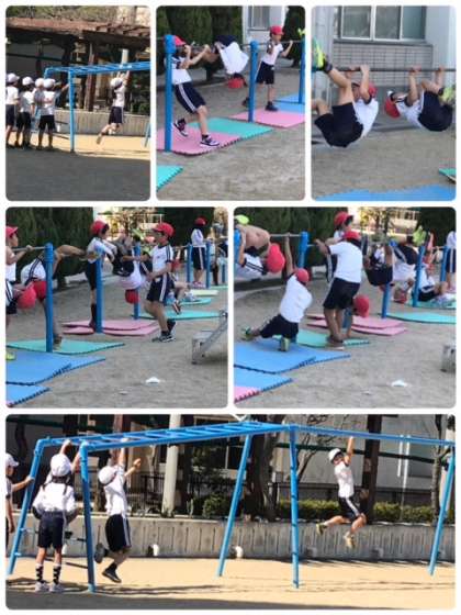 2年生が運動場で体育の学習をしていました。フラッグフットボールの学習と、固定遊具を使った学習をしています。