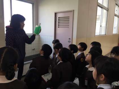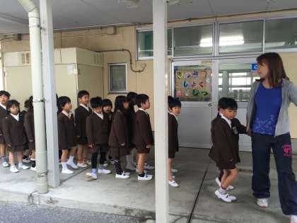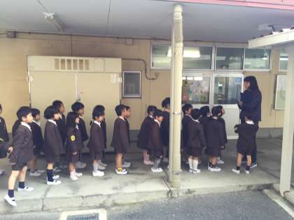 1年生は、午前中に給食室まで並んで行く練習をしました。