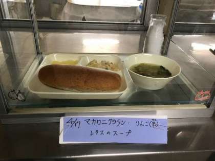 マカロニグラタン、レタスのスープ、りんご、パン、牛乳