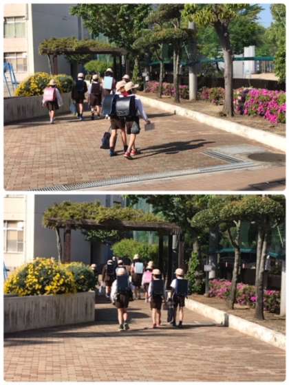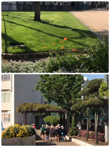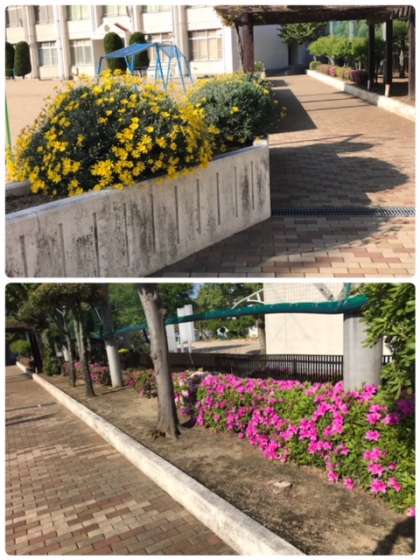 正門からのプロムナード、春の花々が色鮮やかに、子どもたちの登校を出迎えています。