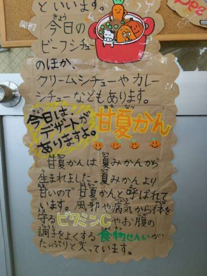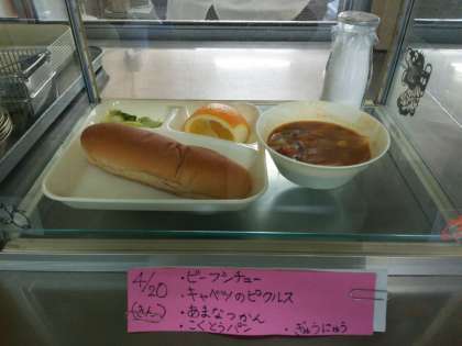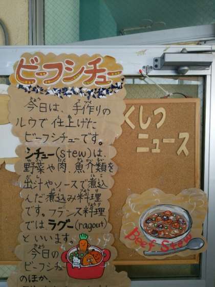 ビーフシチューも子どもたちに大人気のメニューです。運がよければ、ハートや星や花の形をしたラッキー人参が入っています。子どもたちは、わくわくしながら食べています。