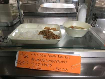 鶏肉とジャガイモの煮物、厚揚げの醤油だれかけ、紅鮭そぼろ、ご飯、牛乳