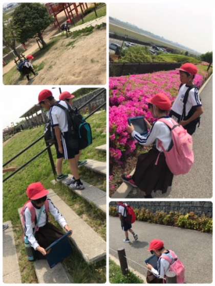 説明の後、タブレットを持って班ごとに、春を探しました。見つけた春はタブレットで撮影し記録しました。