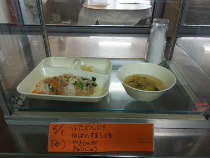 豚どんぶり、湯葉のすましじる、やきじゃが、牛乳です。