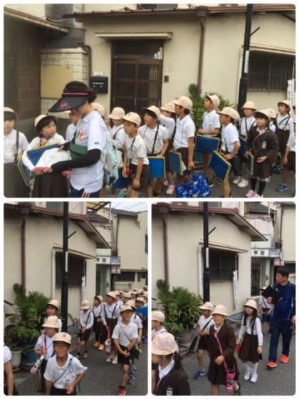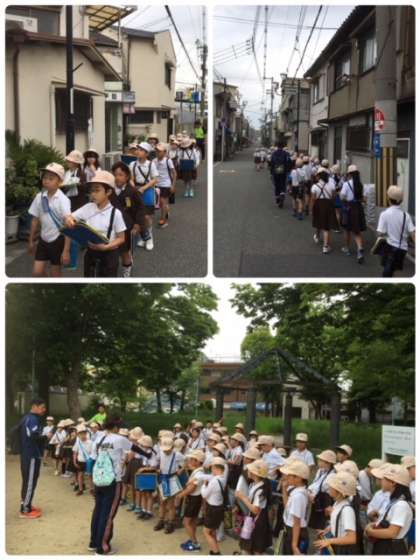 曇り空ですが、3年生は社会科の学習で校区探検に出かけました。