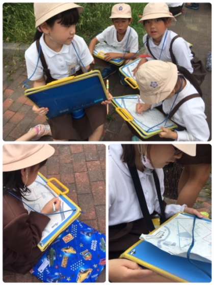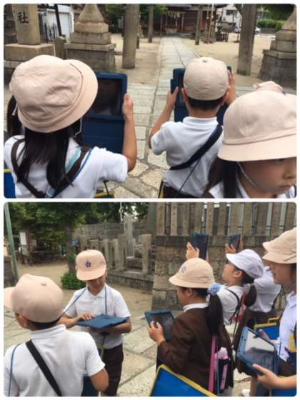 神社に着きました。何かを発見したようで、何やらメモをしています。