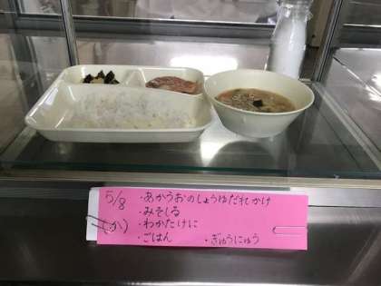 赤魚の醤油だれかけ、若竹煮、味噌汁、ご飯、牛乳