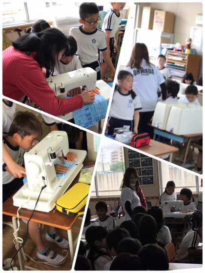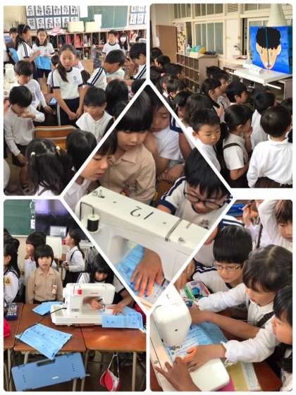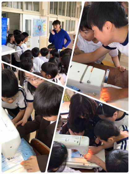 何をしているの?と不思議そうに見てる1年生を5年生が教室へ招待しました。ミシンを使う練習をしていたので、体験したい1年生に優しく教えてあげていました。
