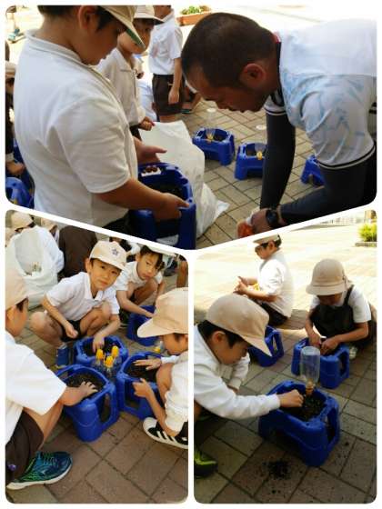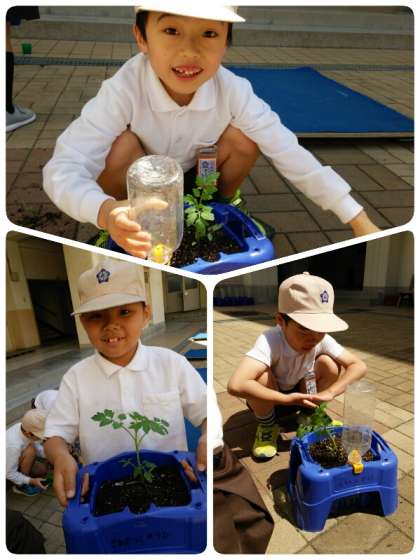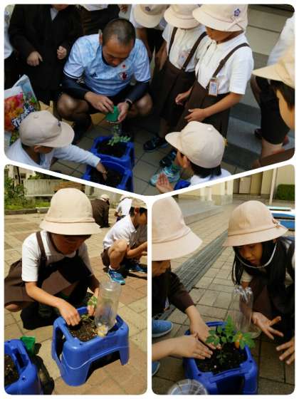 2年1組の児童が中庭でトマトの苗植えをしました。