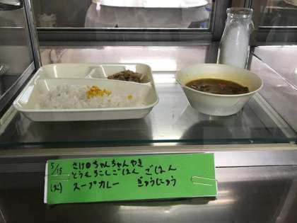 鮭のちゃんちゃん焼き、とうもろこしご飯、スープカレー、牛乳