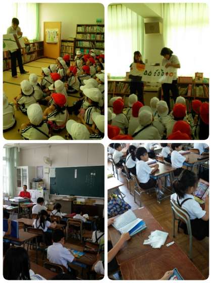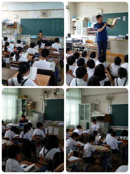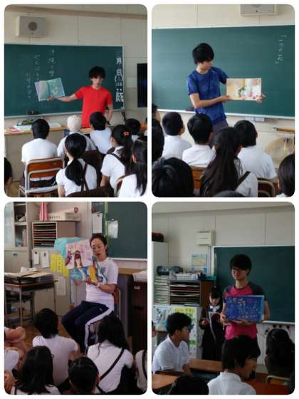 1年生は先生たち二人で大型絵本「はらぺこあおむし」の読み聞かせ、2年生から4年生は自分で選んだ本の一人読み、5・6年生は先生たちによる本や紙芝居の読み聞かせをしていました。