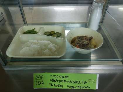 今日の献立は、肉じゃが、きゅうりのかつお梅風味、えだまめ、ごはん、牛乳です。