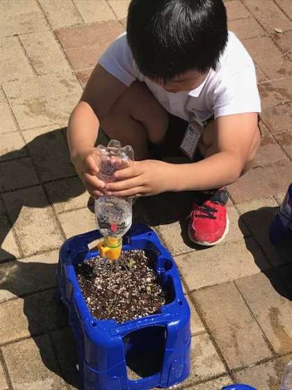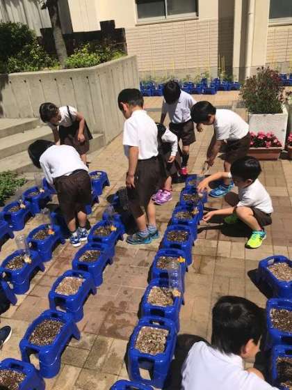 先週タネをまいたアサガオに1年生が水やりをしています。