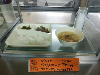 今日の献立は、プルコギ、豆腐のスープ、チンゲンサイとコーンの甘酢あえ、ごはん、牛乳です。