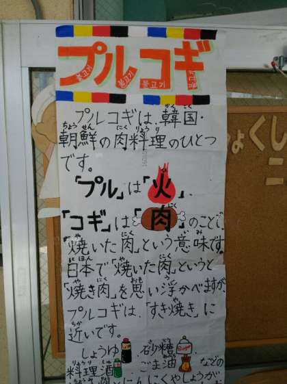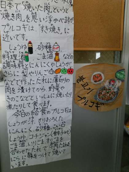 プルコギは、韓国・朝鮮のお肉料理の一つです。日本のすき焼きに似ていて、児童に人気のメニューです。