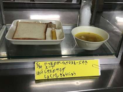 カツオのガーリックマヨネーズ焼き、スープ、レタスのサラダ、食パン、牛乳