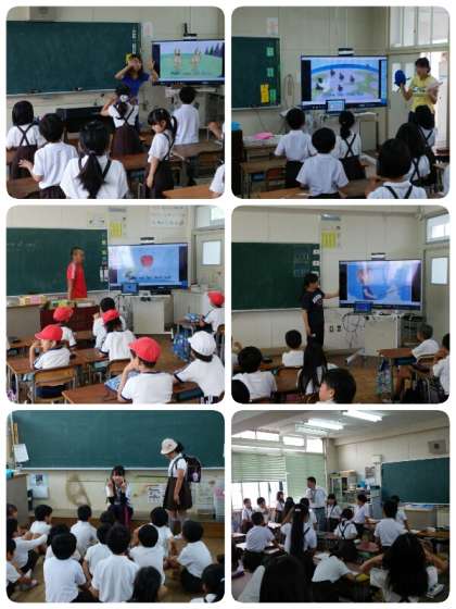 英語のあいさつに始まり、大型テレビを使ってアルファベットジングルや歌などの活動に楽しく取り組んでいました。