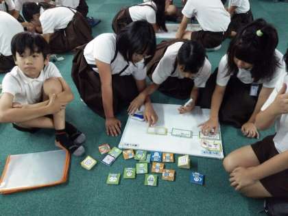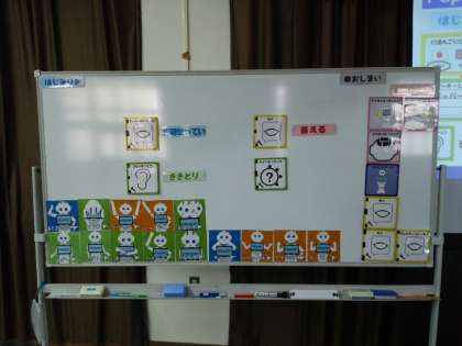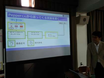 講師の先生から言われた手順でペッパーくんを動かすためのプログラミングを各班でホワイトボードに書いています。