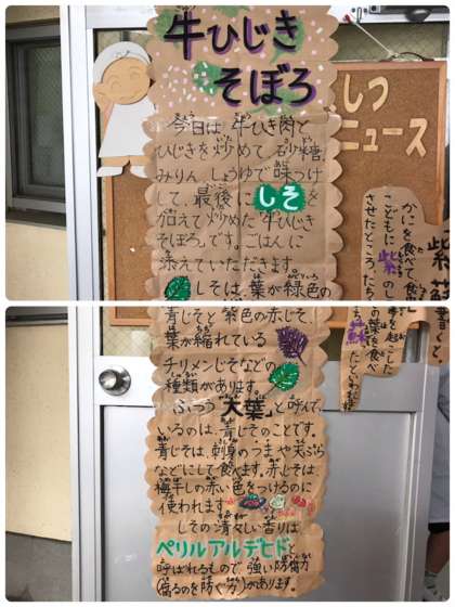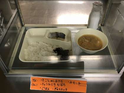 今日の給食は、さごしの塩焼き、牛ひじきそぼろ、みそ汁、ごはん、牛乳です。