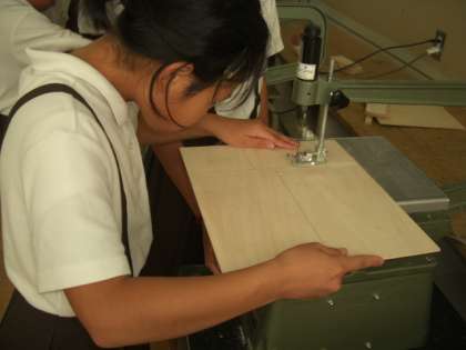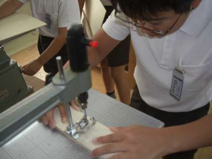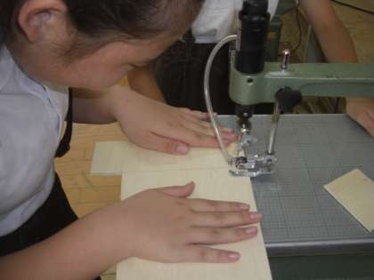 6年生はただいま、工作で電動のこぎりを使っています。