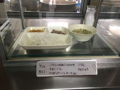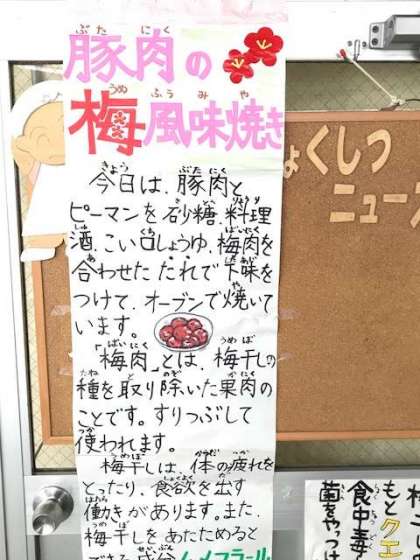 豚肉の梅風味焼き、すまし汁、切り干し大根の炒め煮、ご飯、牛乳