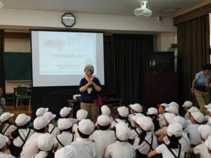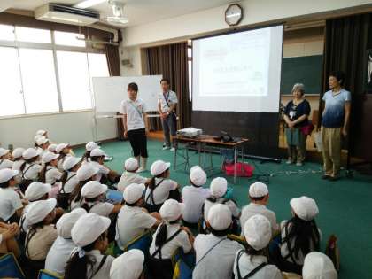 今日は3年生の出前授業で、大阪市環境局の研究センターから講師の方々に来ていただき、生き物さがしをします。