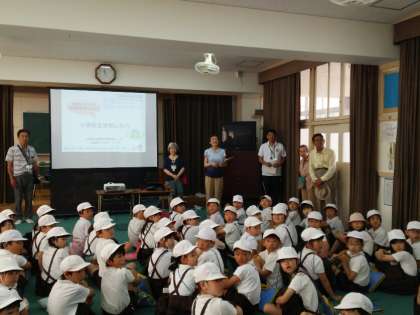 最初に生き物のさがしの方などの話を聞き、その後外に出ます。子どもたちは興味津々で講師の先生の話を聞いています。