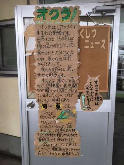 今日の献立は、焼きそば、オクラの中華あえ、オレンジ、こくとうロール、牛乳です。