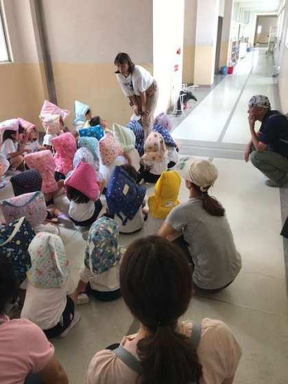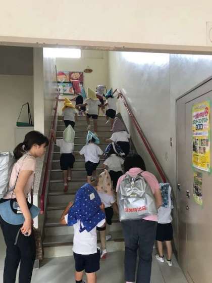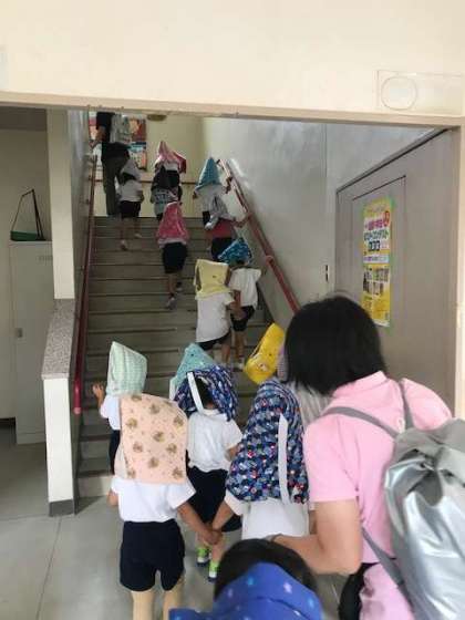 19日、大和田幼稚園が津波の避難訓練として、大和田小学校へ避難しました。津波から身を守るために4階へ避難しました。みんな静かに素早くできていました。