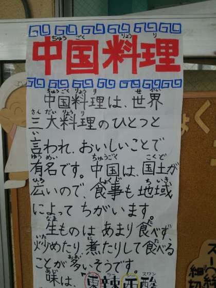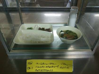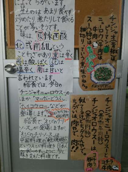 今日の給食の献立は、チンジャオニューロウスー、ハムと野菜の中華スープ、きゅうりの辛みづけ、ごはん、牛乳です。
