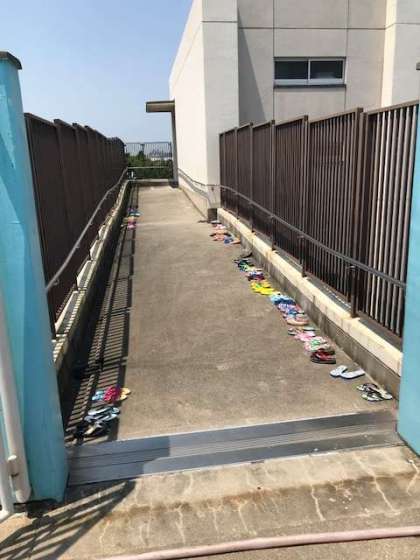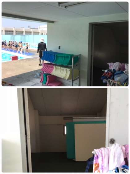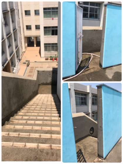 いつも6年生の教室の横からプールにむかいます。しかし、余震の心配もあります。