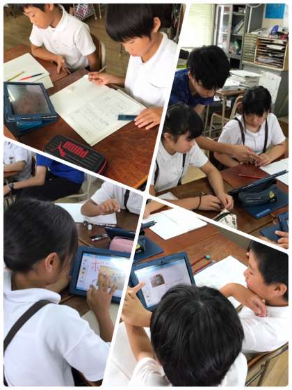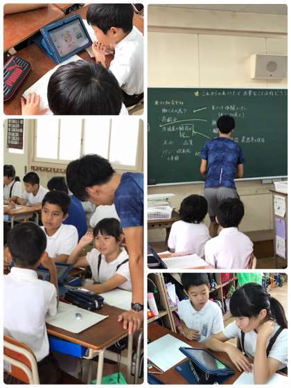 1時間目、5年2組で社会の学習が行われていました。子どもたちはペアで対話しながら、タブレット端末にある資料から調べていました。また、これからの米作りについてどうしたらいいか考えてグループ全体で発表していました。