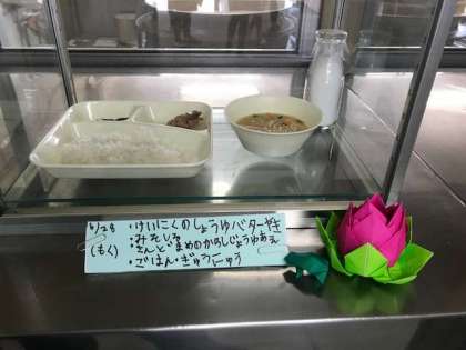 鶏肉の醤油バター焼き、味噌汁、三度豆のからし醤油あえ、ご飯、牛乳