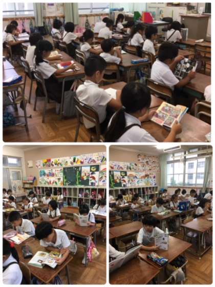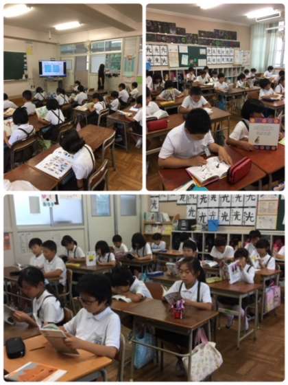 今日は木曜日。読書タイムの日です。外は大雨ですが、子ども達は静かに読書をしたり紙芝居に見入っていました。